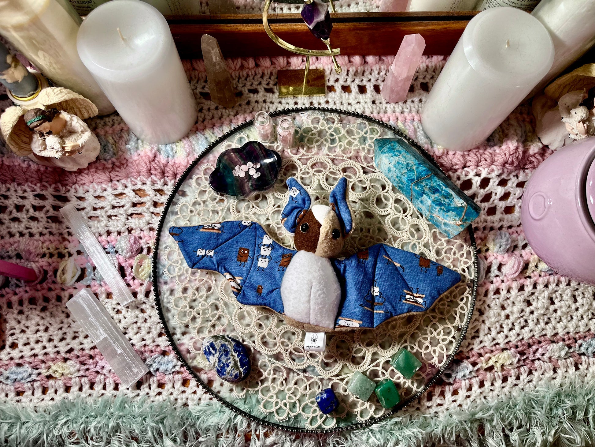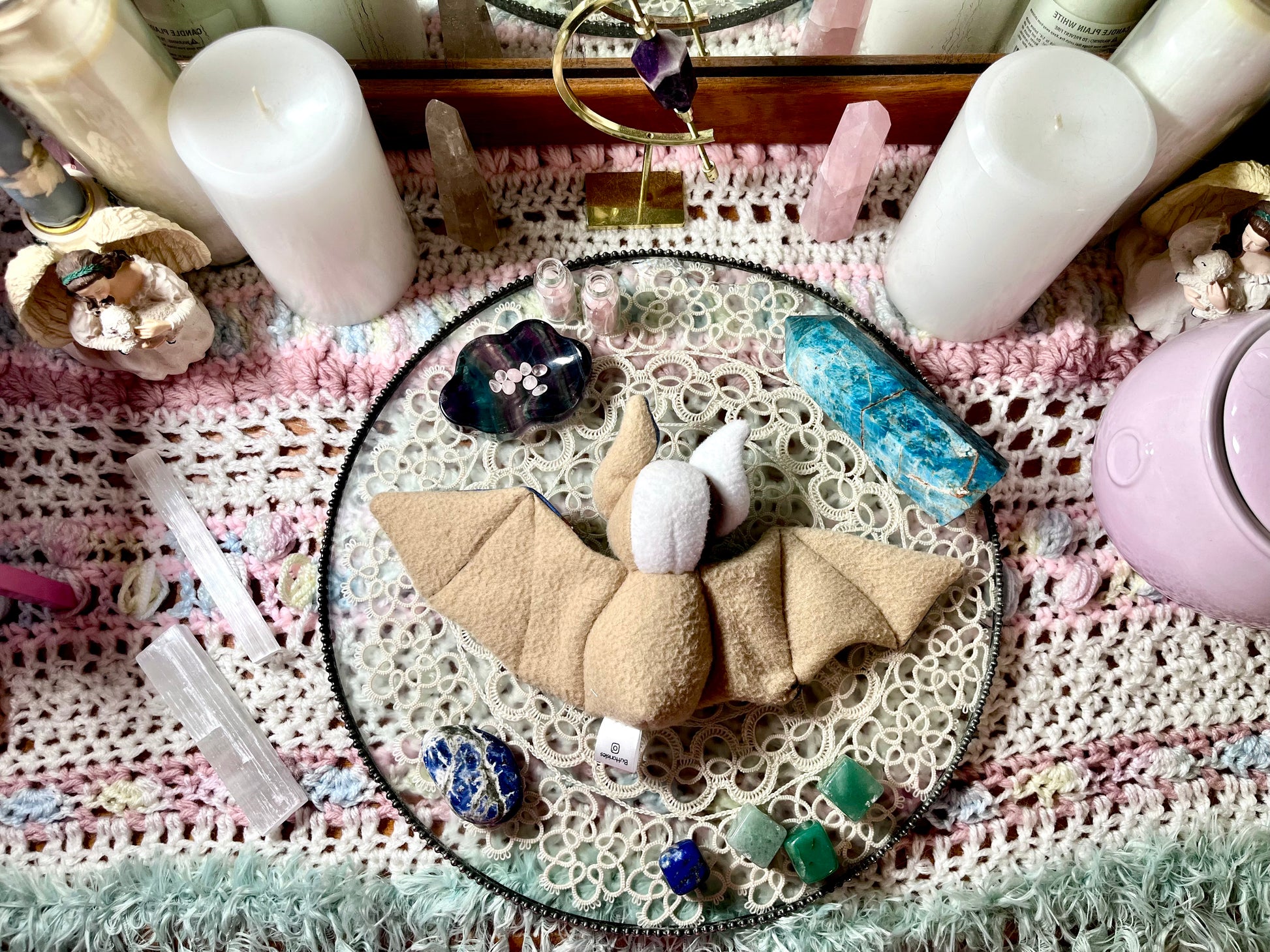 To make sure the bat plushie can sit on a shelf or a bed without falling over, it's stuffed with polyfill and beads to weigh it down. This makes it easy to display and keeps it from rolling around.