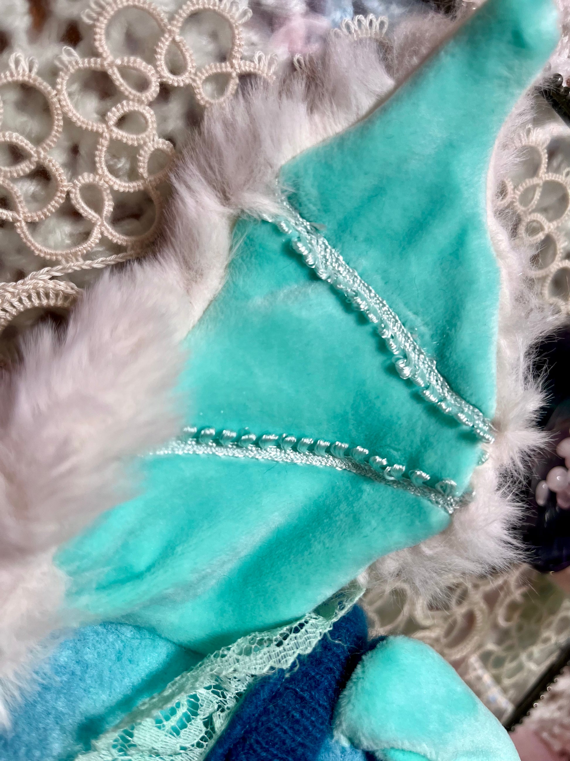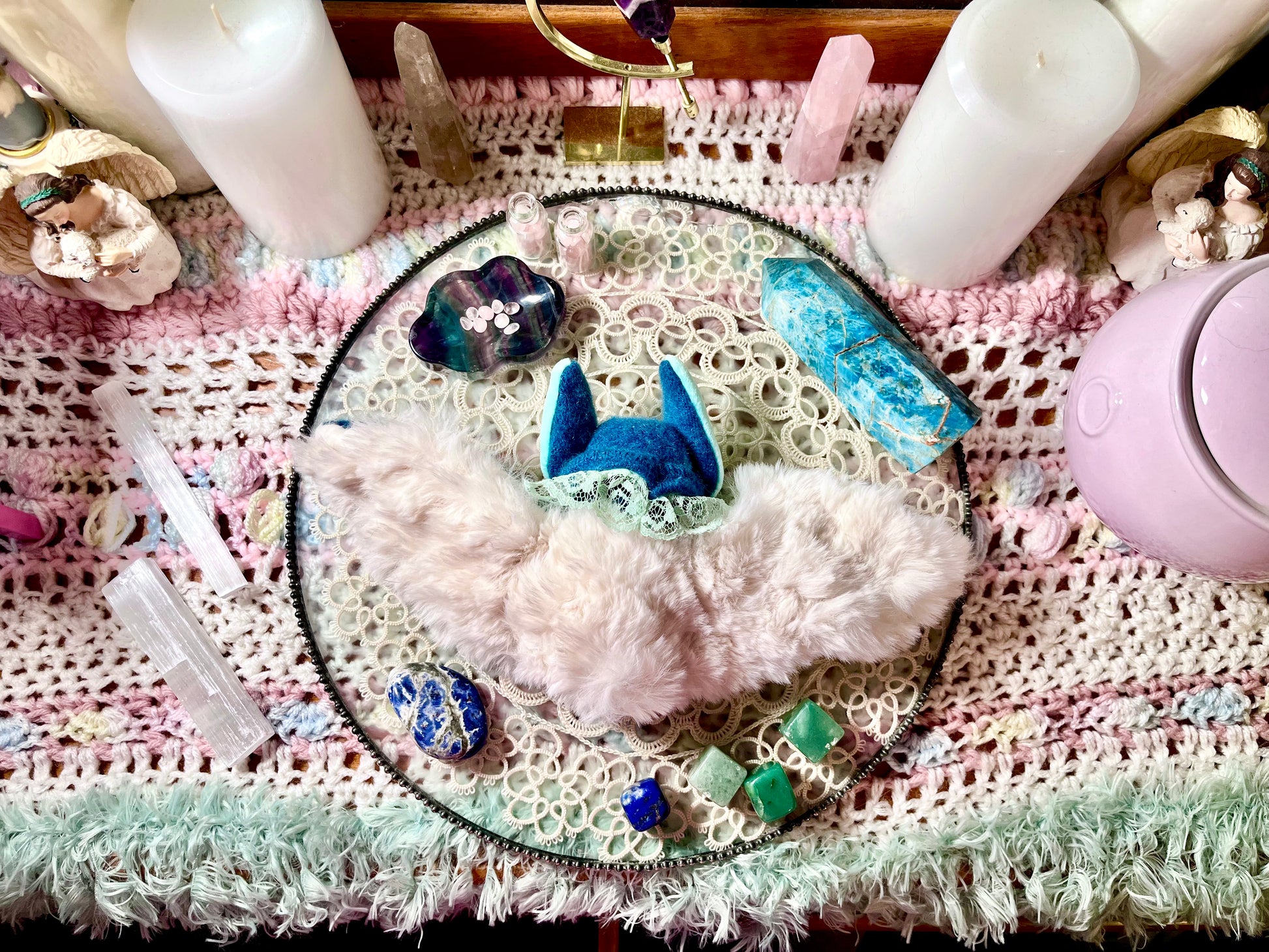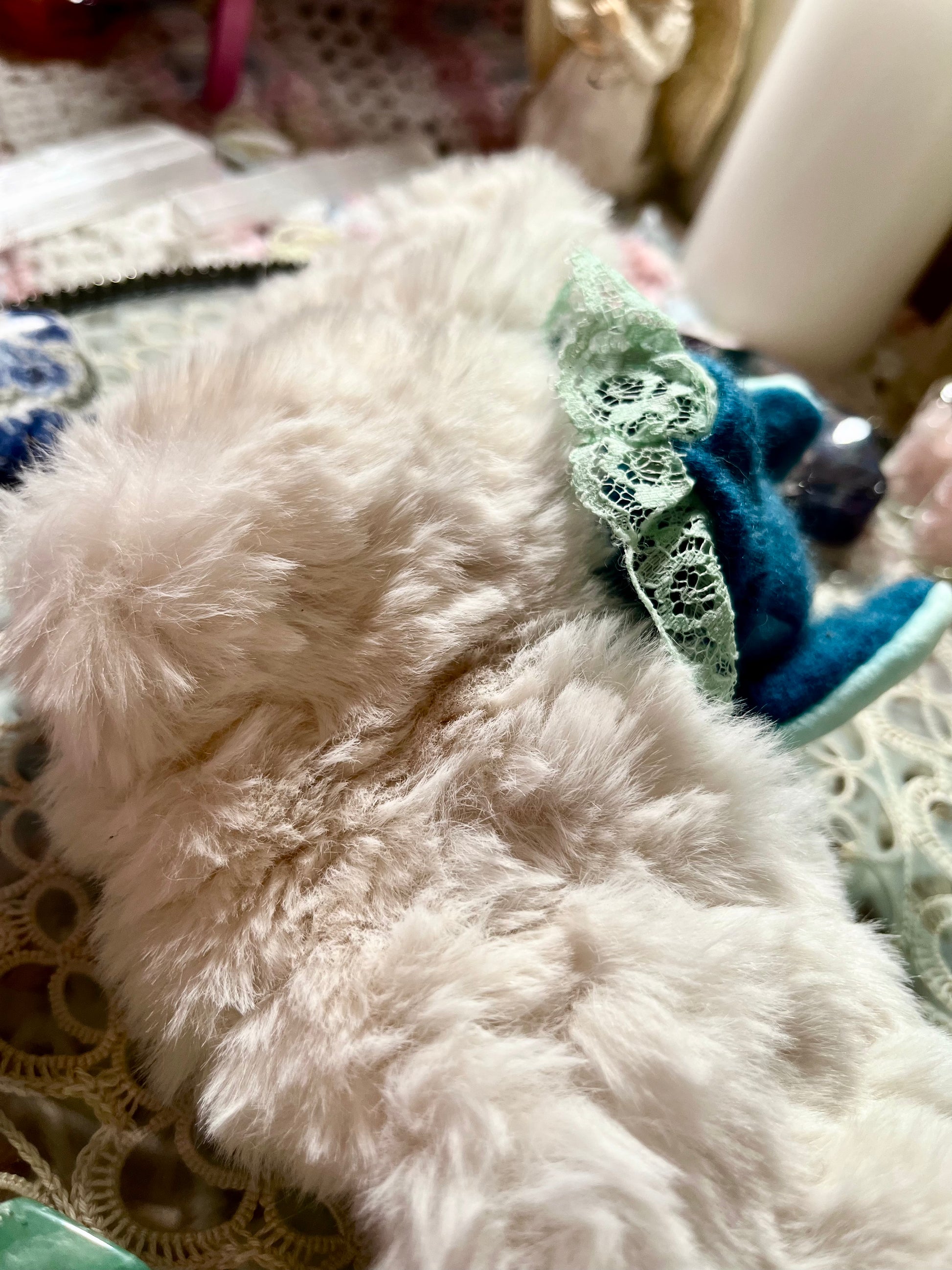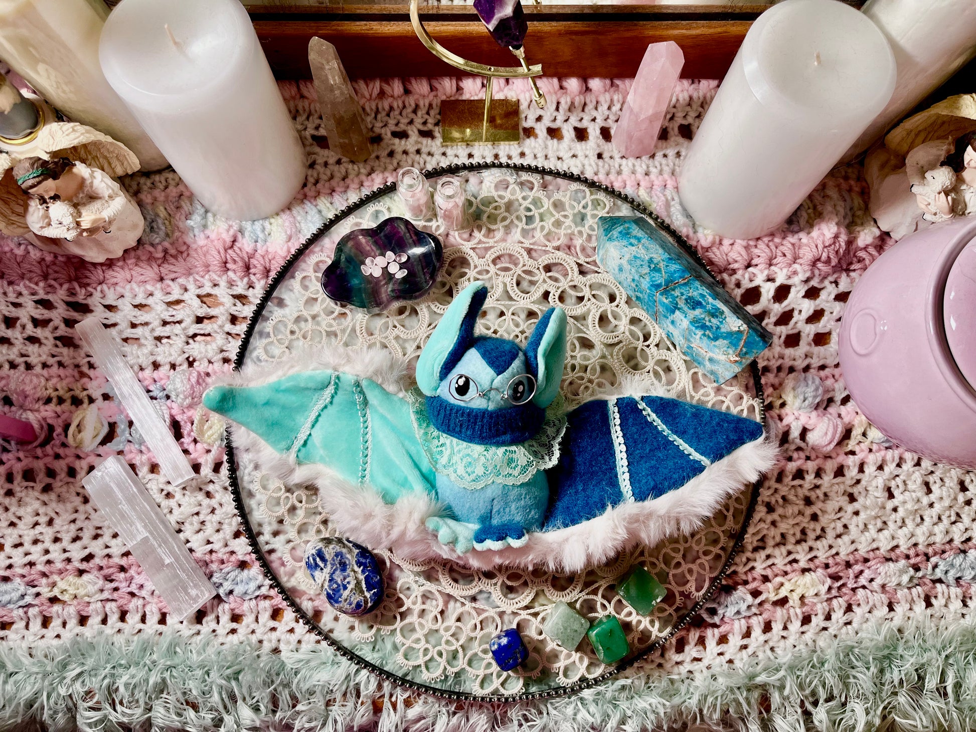 This bat is made with premium Faux Rabbit fur, ultra soft minky, as well as cashmere from a recycled cashmere sweater. He was given glasses crafted out of aluminum wire to match his prestigious personality and he is stuffed with Lapis Lazuli crystal chips which not only give him significant weight compared to other bats, but this crystal is known for it's emotional regulation and healing properties.