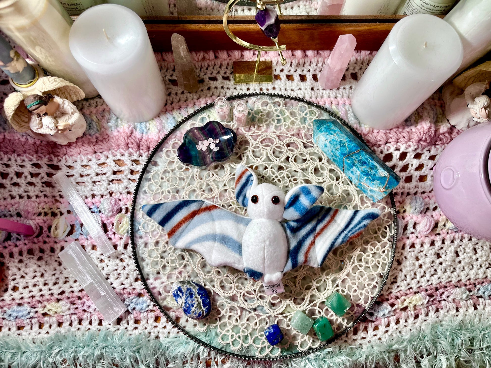 Introducing the adorable bat plushie, perfect for anyone who loves cuddly and cute creatures. With an 11" wingspan and standing approximately 4" tall, this bat plushie is the perfect size for hugging, snuggling, or displaying on a shelf.