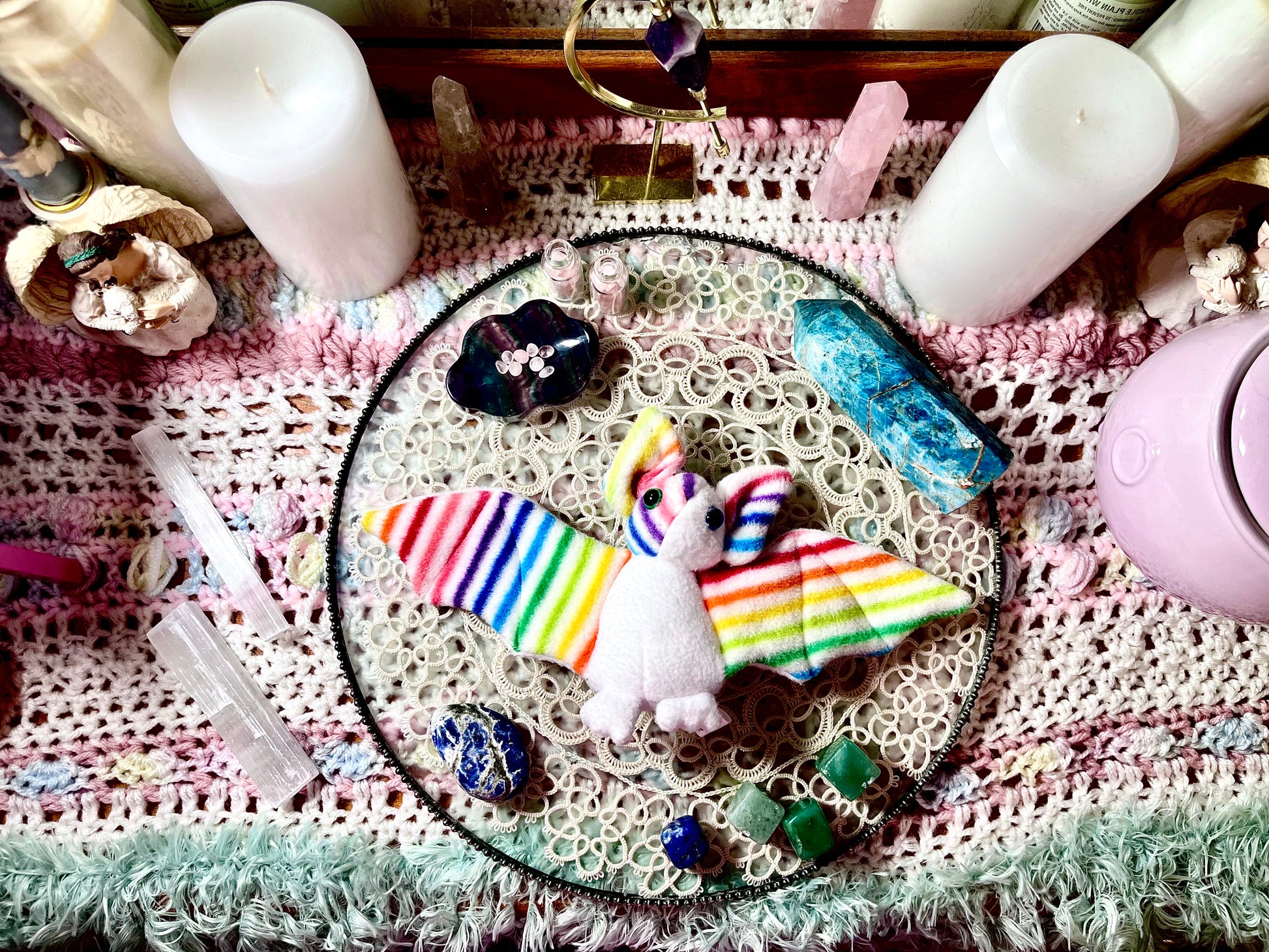 To make sure the bat plushie can sit on a shelf or a bed without falling over, it's stuffed with polyfill and beads to weigh it down. This makes it easy to display and keeps it from rolling around.