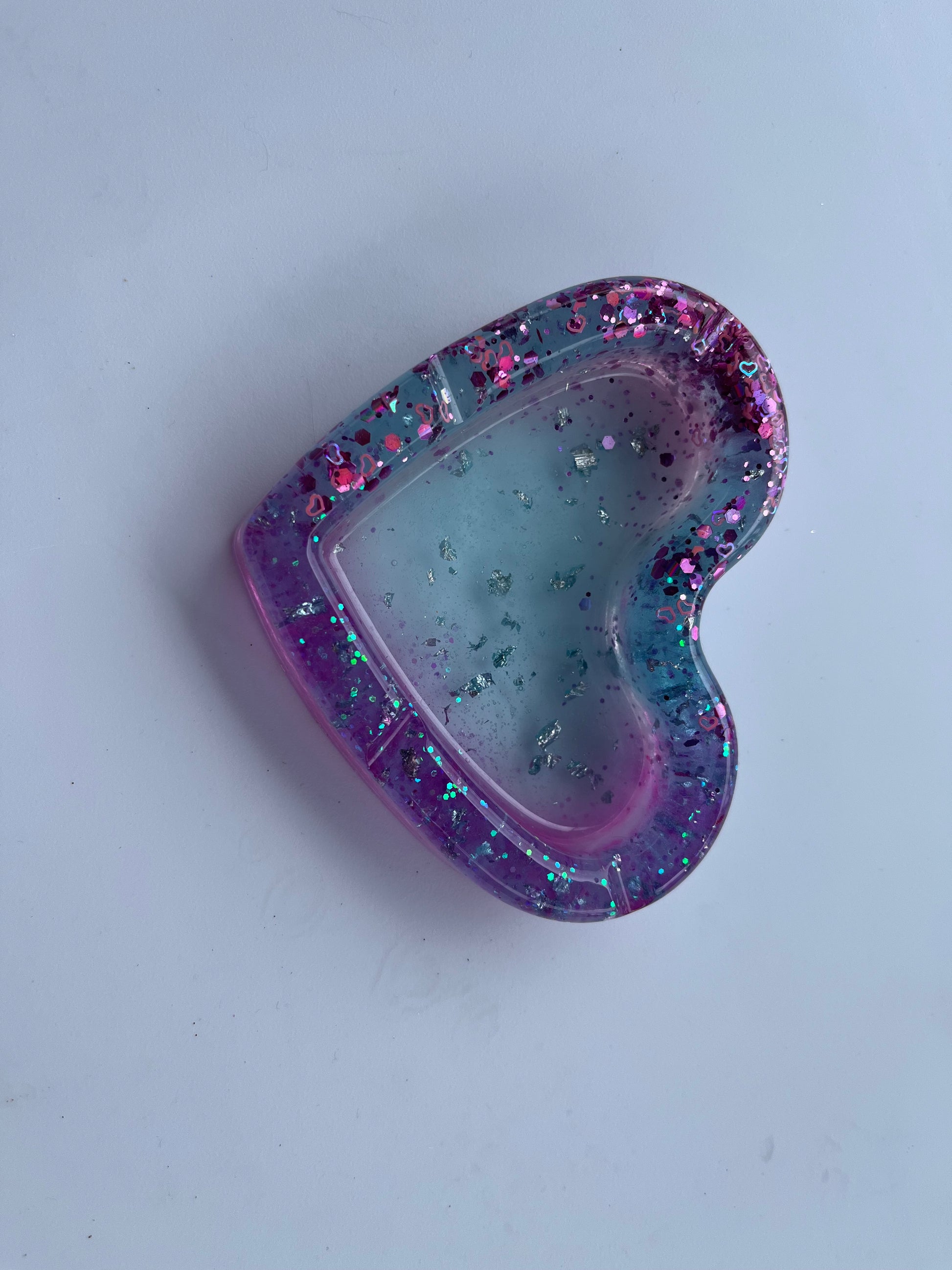This solid piece is made completely out of resin with pink, blue and clear dye as well as lots of purple and pink heart shaped confetti inside.