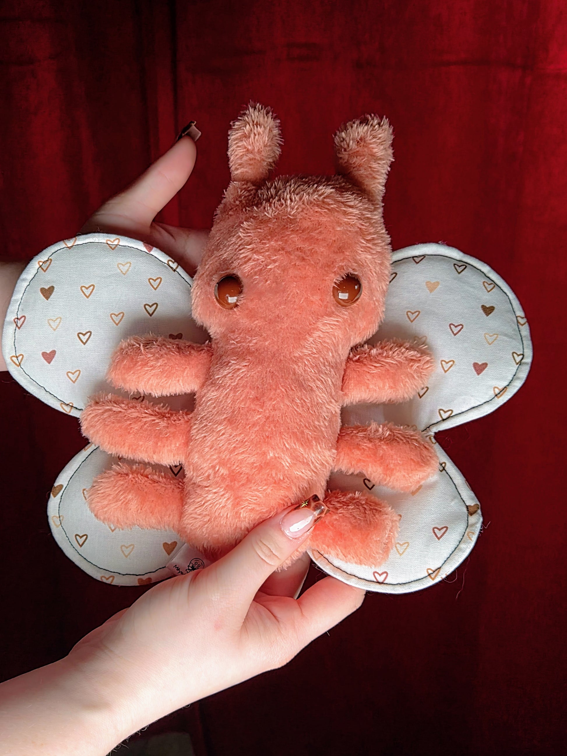 At 9 inches tall, this moth makes a perfect decorative accent or cuddly companion. This moth is sewn together with short pile fur and quilting cotton for the wings. It is stuffed with Luxury Down Alternative stuffing as well as a pair of safety eyes. This Love Bug's wings has quilt batting making them slightly flexible and perfect for playtime or snuggling.