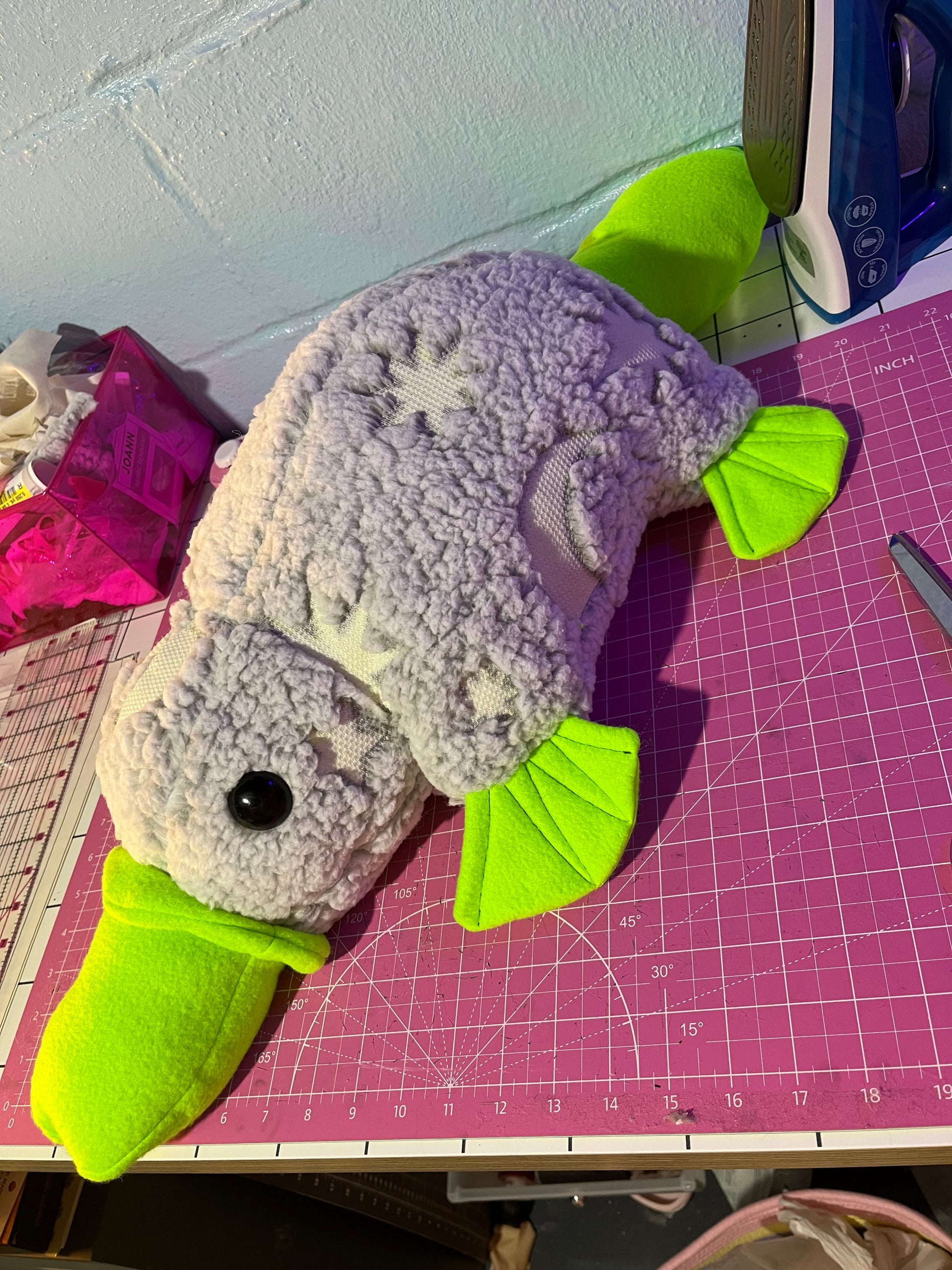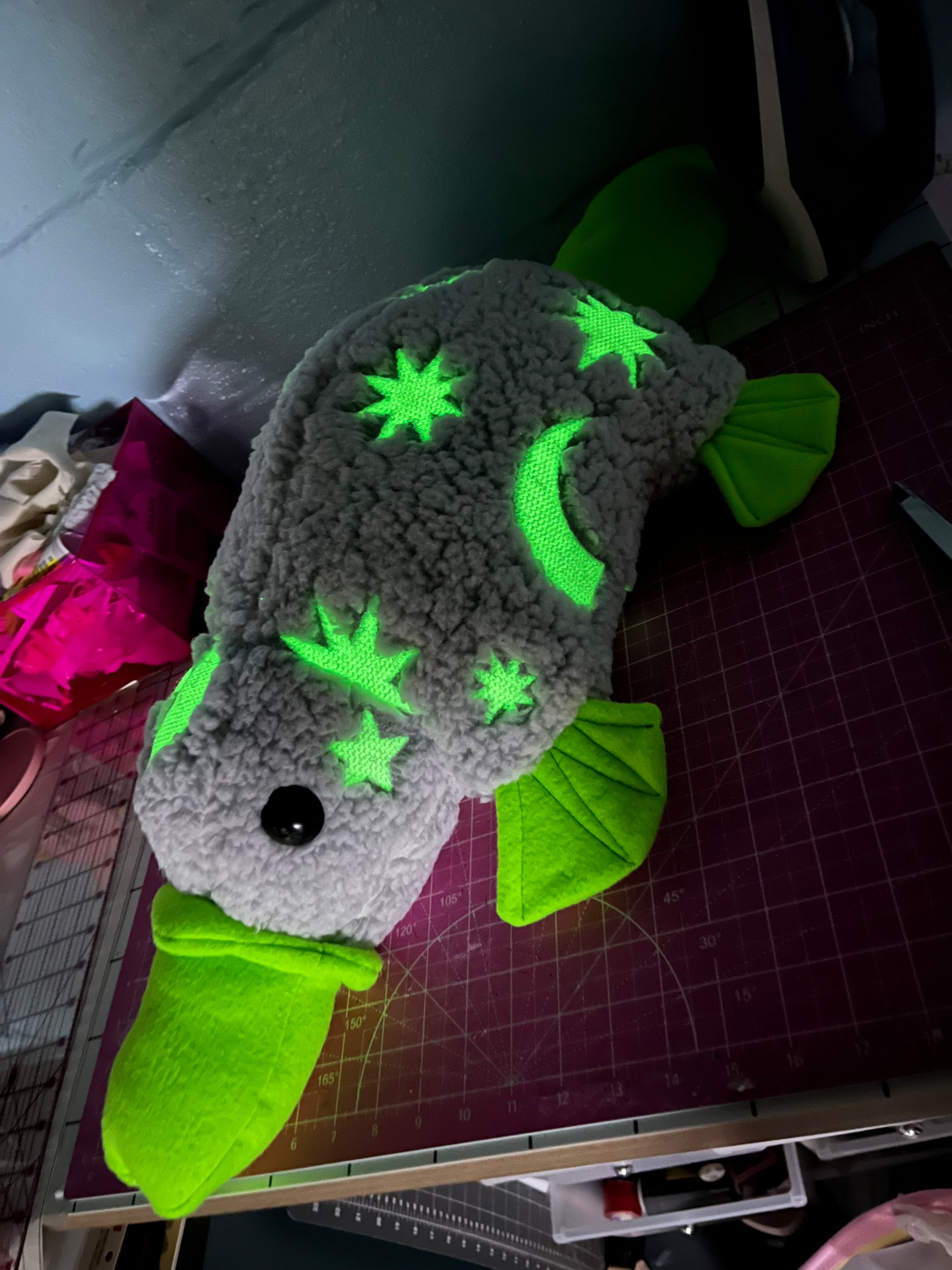 With a focus on realism, this platypus features a detailed design, including its characteristic duck-bill and webbed feet, all crafted from top-quality, hypoallergenic materials. The body, made from a specialty Sherpa with glow in the dark stars and moons scattered throughout, is soft to the touch, providing a soothing tactile experience.