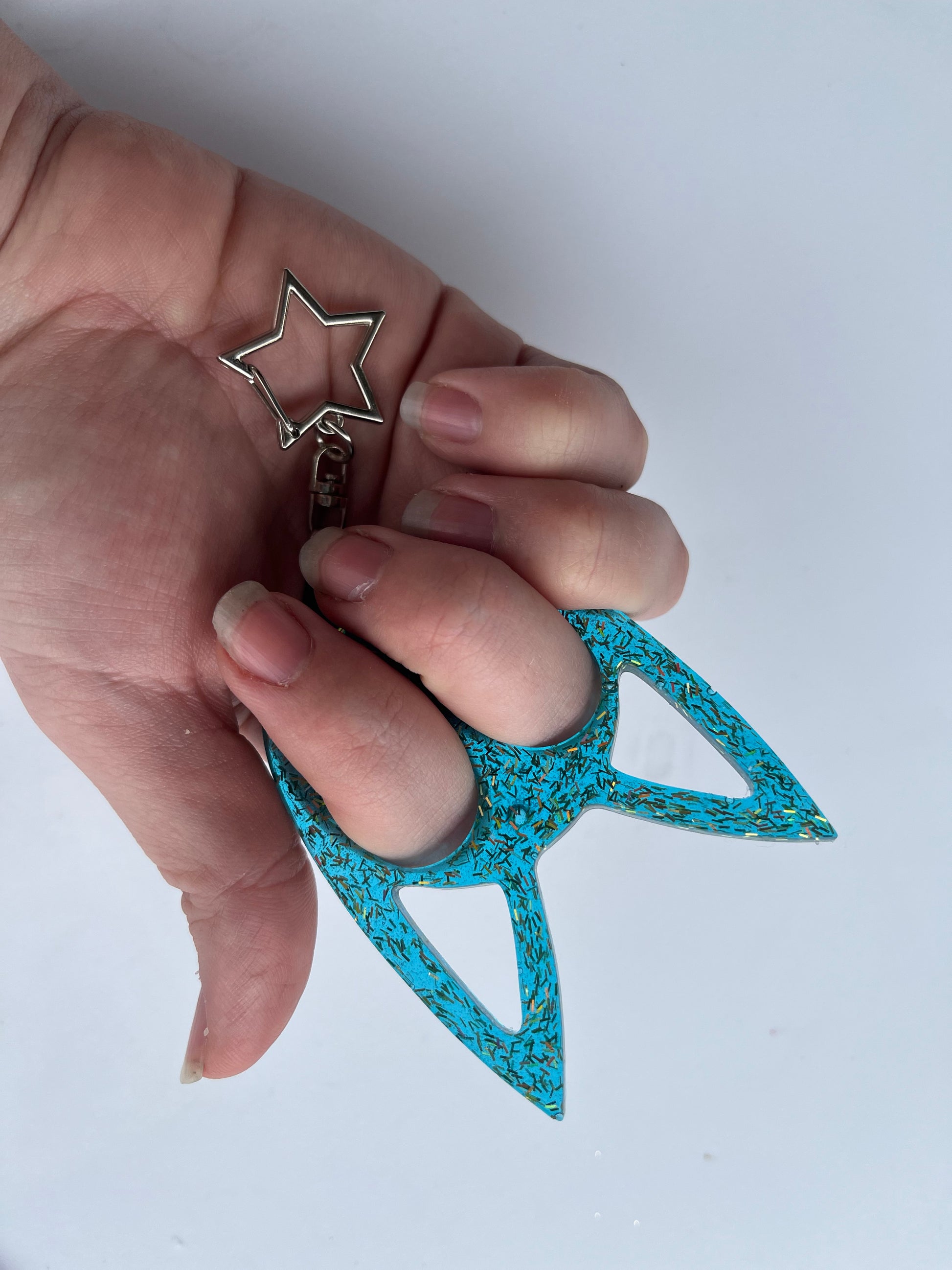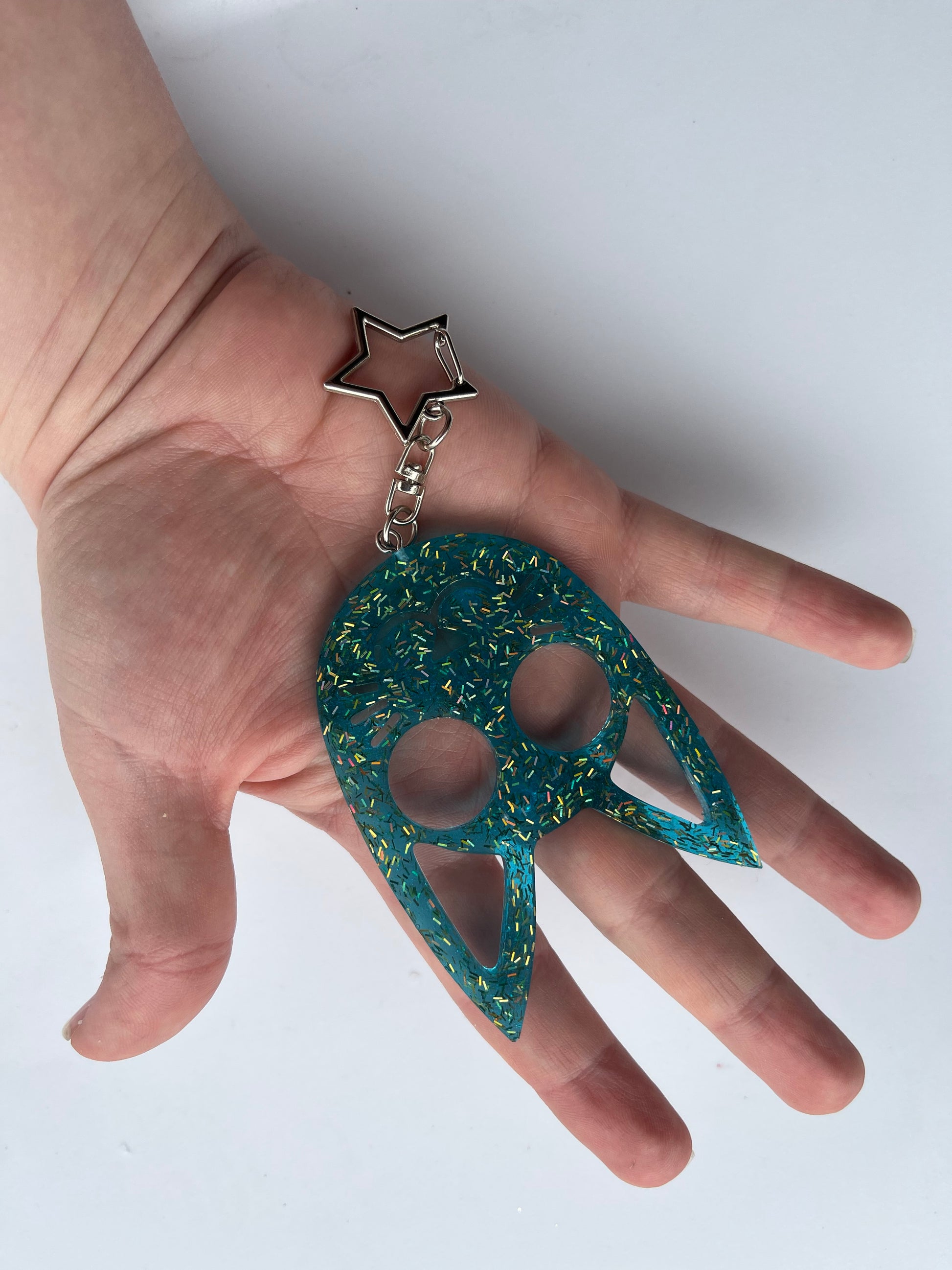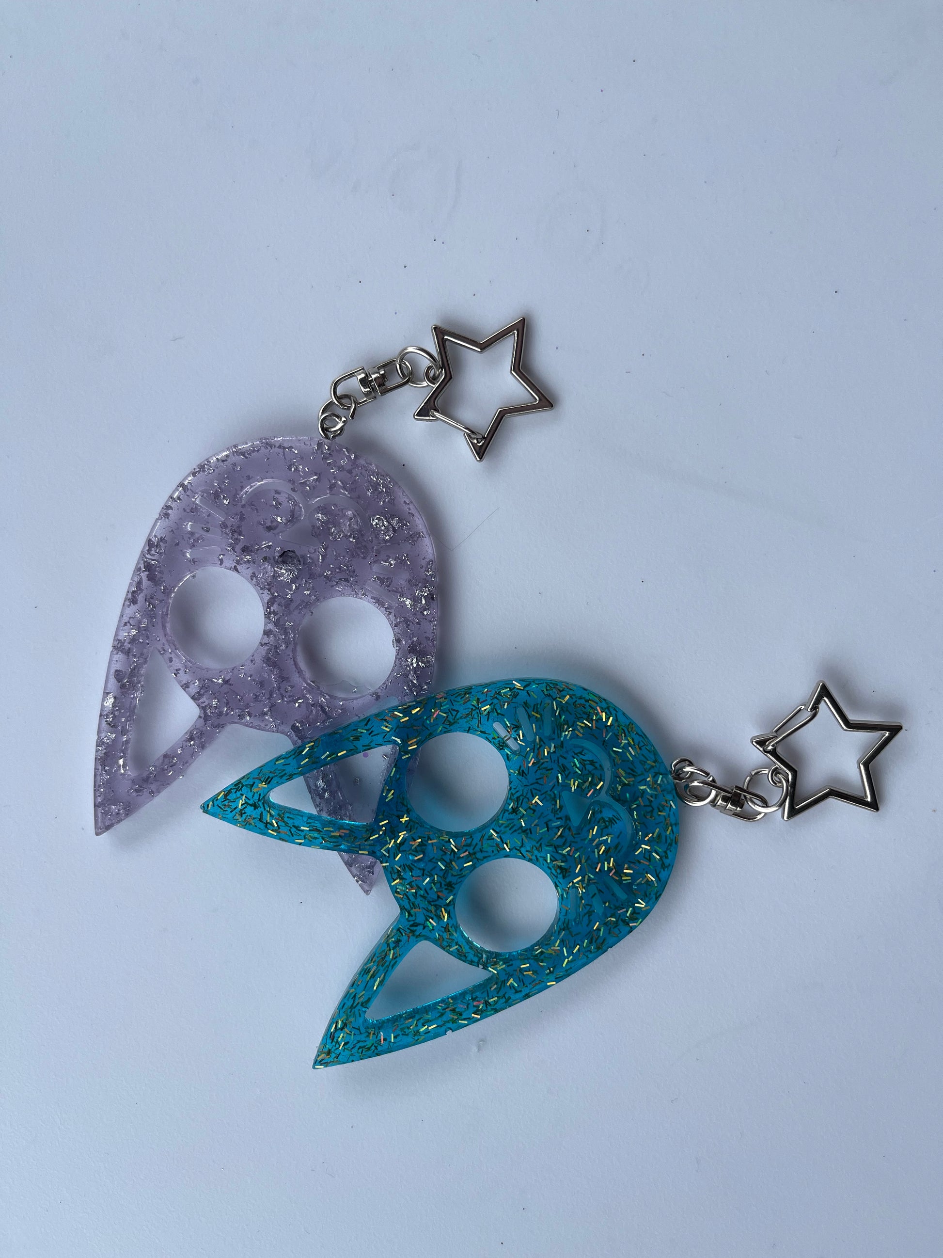This cat face keychain is the perfect size to fit in your hand. It measures about 3.5 inches and has a star shaped keychain bezel. The eye holes are about 3/4" in diameter.